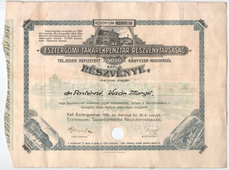 1924 Esztergom "Esztergomi Takarékpénztár Részvénytársaság" ... https://www.darabanth.com/hu/498-Gyorsarveres/498.0/Numizmatika/Reszvenyek-es-sorsjegyek~1000095/1924-Esztergom-3Cem3EEsztergomi-Takarekpenztar-Reszvenytarsasag3Cem3E-reszvenye-4000K-rol-s~II3278128
