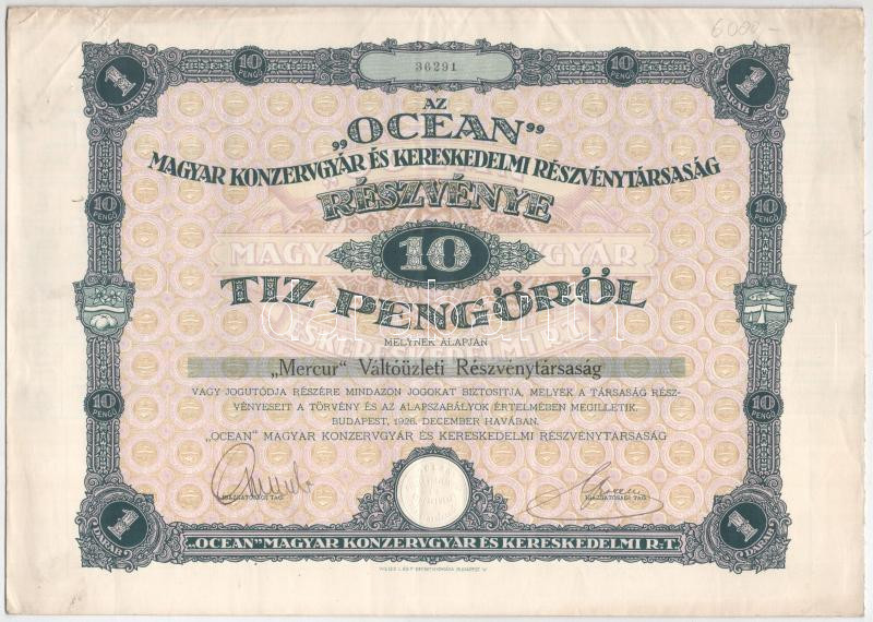 1926 Budapest "Az 'OCEAN' Magyar Konzervgyár és Kereskedelmi Részvénytársaság" névre szóló részvénye 10P-ről, szárazpecséttel, szelvényekkel T:F szép papír