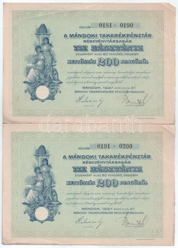 Leírás: 1927 Mándok "Mándoki Takarékpénztár Részvénytársaság " tíz részvénye egyenként 20P-ről, összesen 200P-ről (2x) sorszámkövetők T:XF,VF foltok