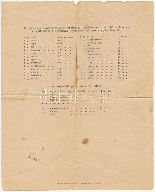 1946 Budapest "A Magyar Köztársaság 4%-kal kamatozó, búzaértékben megállapított államadóssága - Államadóssági kötvény" 10kg búza pénzbeli egyenértékéről T:F szakadások