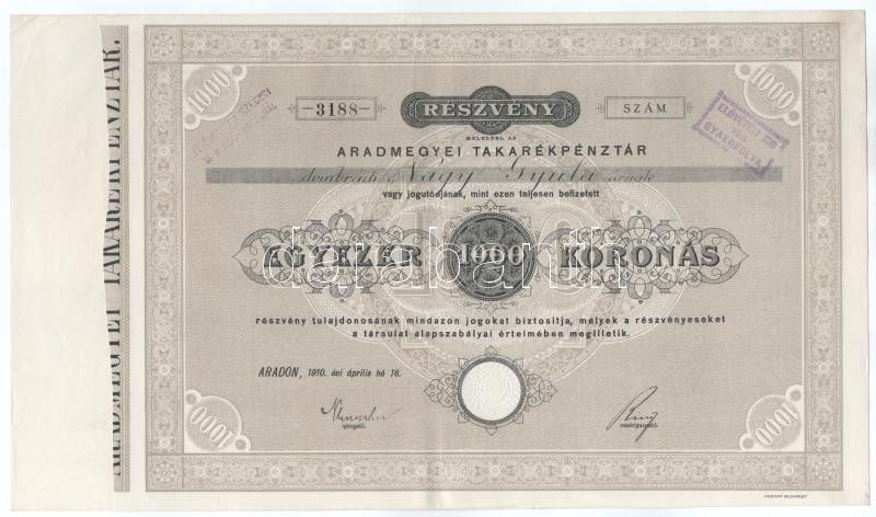 Leírás: Arad 1910. "Aradmegyei Takarékpénztár " névre szóló részvénye 1000K értékben, "ELŐVÉTELI JOG GYAKOROLVA 1911." felülbélyegzéssel és szárazpecséttel T:XF