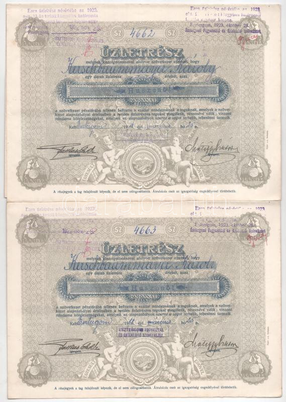 Esztergom 1918. "A Hangya kötelékébe tartozó Fogyasztási és Értékesítő Szövetkezet" üzletrésze 25K-ról (2x) sorszámkövetők "4662-4663", szelvényekkel, felülbélyegzésekkel T:AU kis folt