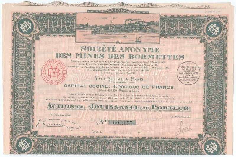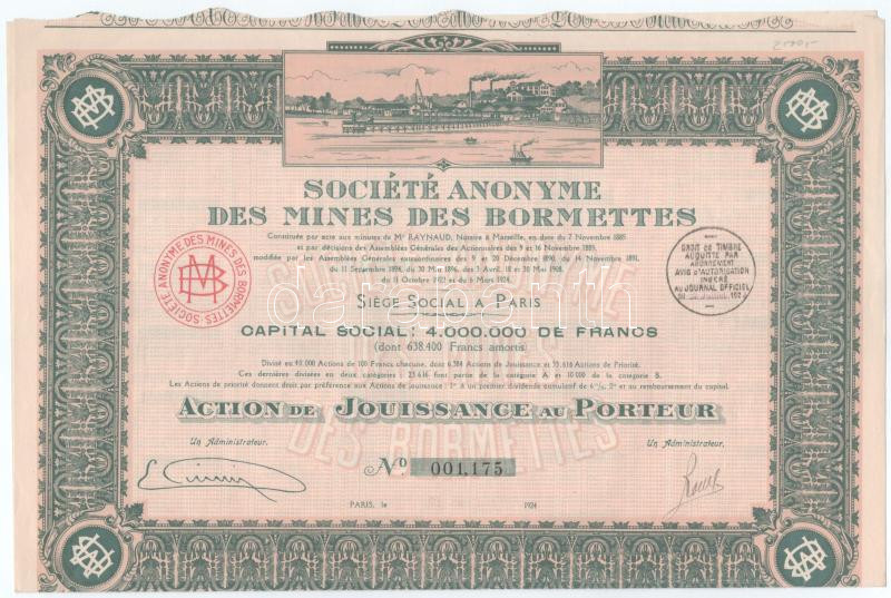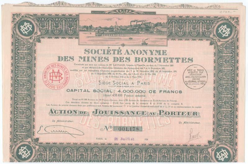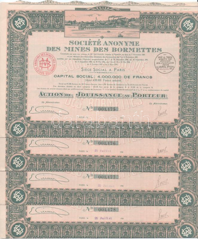 Franciaország / Párizs 1924. "Société Anonyme des Mines des Bormettes" részvény 100Fr-ről (4x) sorszámkövetők "001175 - 001178" T:AU