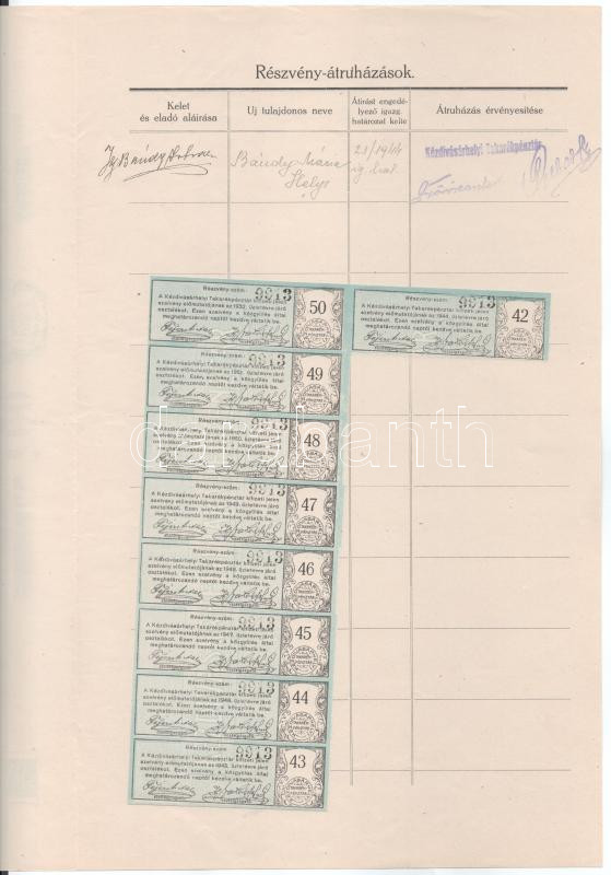 Romania / Targu Secuiesc 1926. "Savings Bank of Kézdivásárhely" share about 300 Leu with shareholder's name, embossed stamp, coupons and overprints C:AU