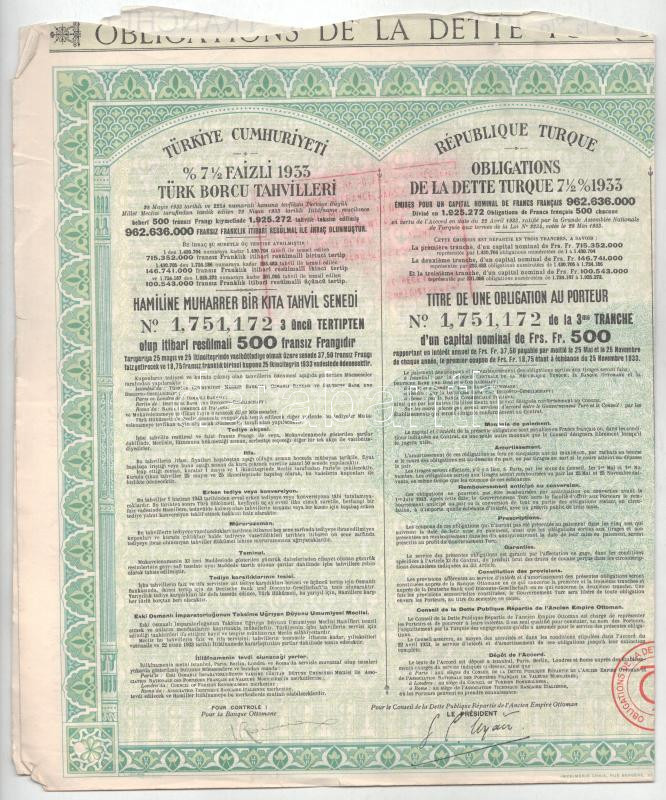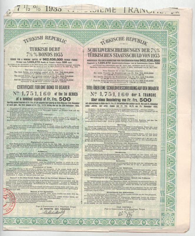 Leírás: Törökország 1933. "7 1/2%-os Török Államadóssági kötvény, 1933, 2. és 3. sorozat" kötvény 500Fr-ról felülbélyegzésekkel, szelvényekkel (4x), közte sorszámkövetők, lyukasztással érvénytelenítve T:F Turkey 1933. "Turkish debt 7 1/2% bonds 1933, 2nd and 3rd series" bond about 500 Francs with overprints and coupons (4x), with sequential serials, cancelled by holes C:F