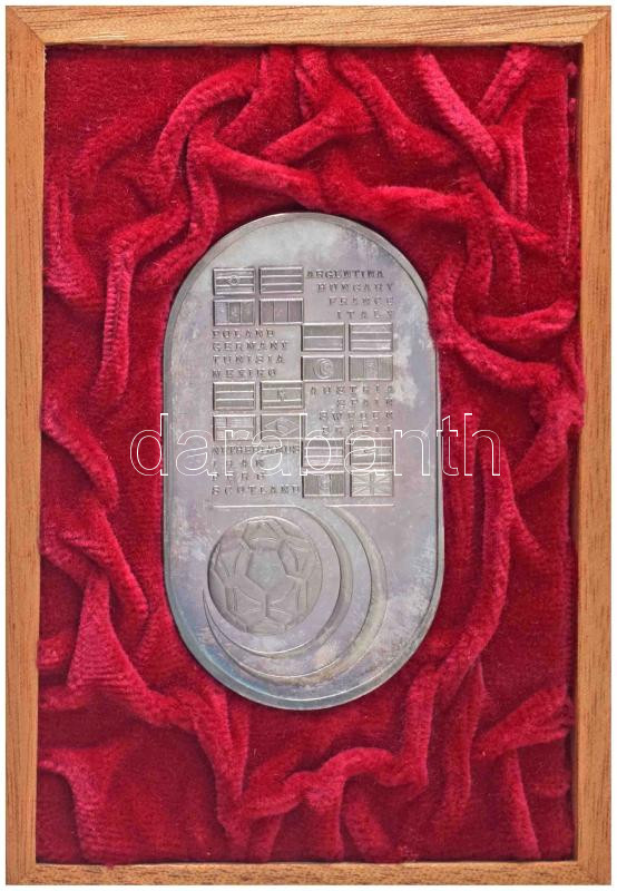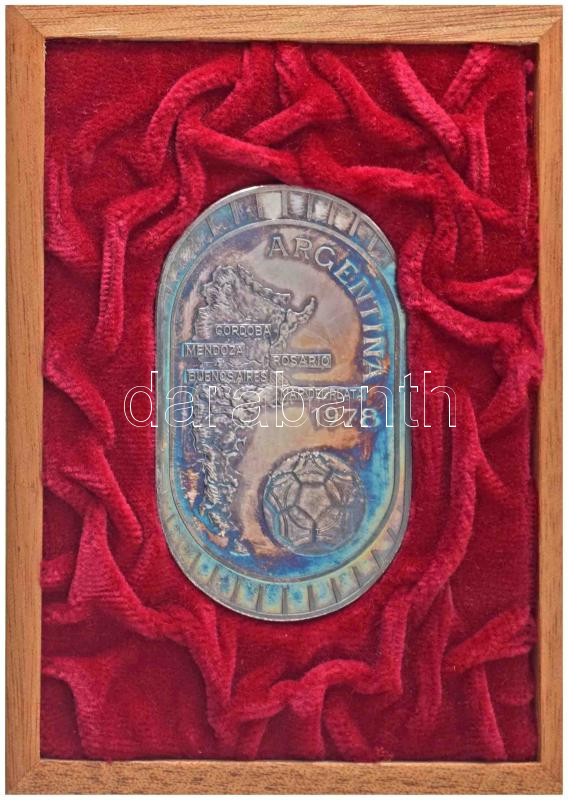 Leírás: 1978. "Labdarúgó VB Argentina" peremén jelzett, stadion formájú Ag plakett, tanúsítvánnyal, fa dísztokban (67,63g/1.000/43x72mm) T:UNC (eredetileg PP) patina