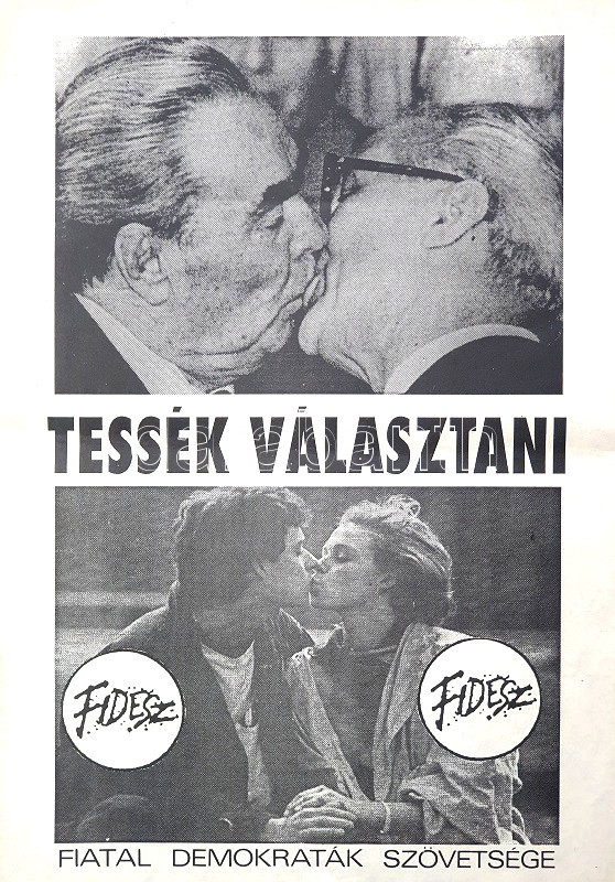 A kettős fényképből összeállított választási plakáton felül Leonyid Brezsnyev szovjet és Erich Honecker keletnémet főtitkár szájra adott csókja látható, amely szimbolikusan a legmélyebb kapcsolatot fejezte ki a felek közt (a kevésbé kegyelt szocialista államok vezetőinek be kellett érniük a szimpla vagy kétszeres, pusztán arcra adott Brezsnyev-csókkal). A plakát alsó részén súlyos politikai függés veszélyétől mentesen csókolózó fiatalok képe. Választási plakátunk üzenete egyértelmű, és a hierarchikus rend helyett a szabad, önálló választás lehetőségének fontosságát sugalmazza.