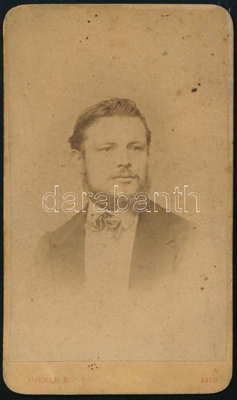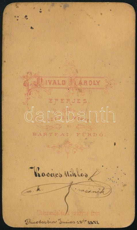 Leírás: 1871 Kovács Miklós mérnök dedikált fotója, vizitkártya Divald Károly eperjesi műterméből, kissé foltos, 10,5x6 cm