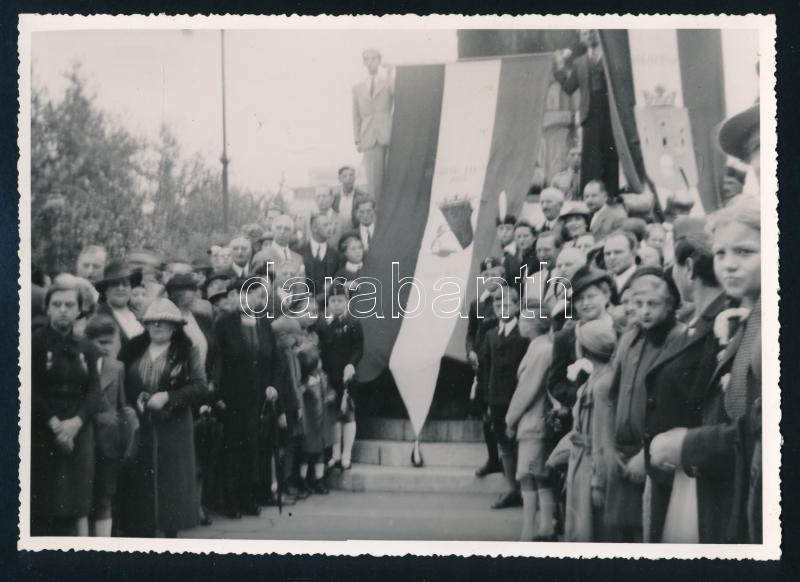 Leírás: 1940 A nagyszalontai (Erdély) országzászló avatása Budapesten. a Nagyszalontai Társaság ajándékaként. hátoldalt feliratozott fotó 18x14 cm