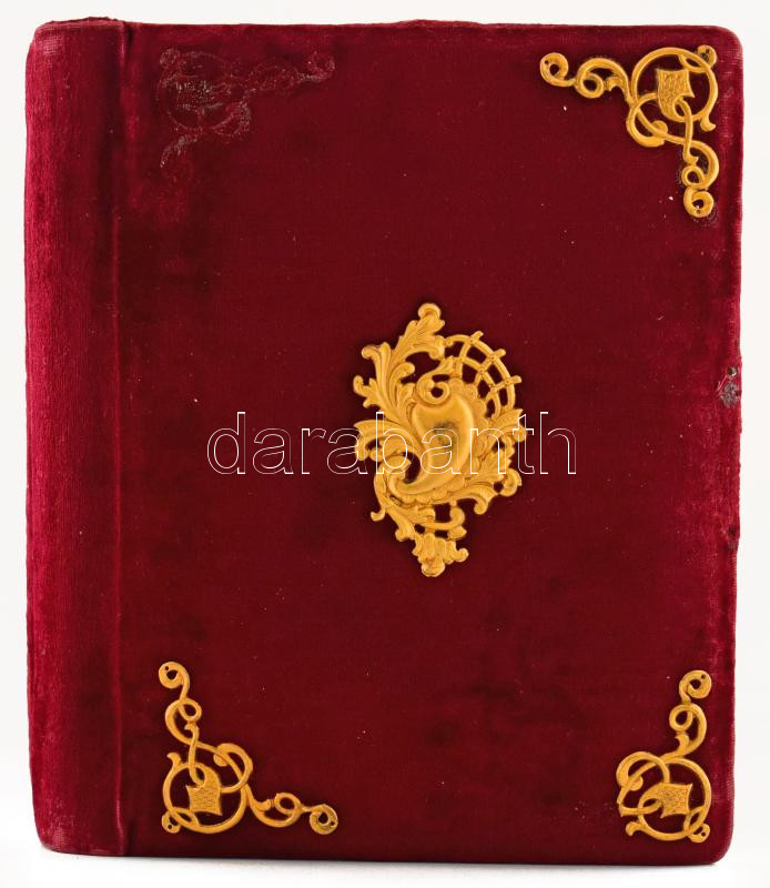 Bordó bársonyborítású, fém rátétekkel díszített régi fotóalbum kabinetfotók, vizitkártyák számára, egy lejáró rátéttel, helyenként kisebb sérülésekkel, 25x20x5 cm