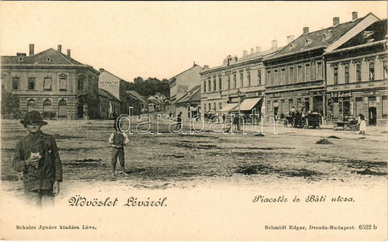 Leírás: Léva, Levice; Piac tér, Steiner szálloda, Báti utca, Engel József, Weisz Salamon és társa üzlete. Schulcz Ignác, Schmidt Edgar kiadása / square, street, shops
