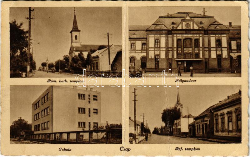 Leírás: 1943 Csap, Cop, Chop; római katolikus és református templom, iskola, pályaudvar, vasútállomás / churches, school, railway station (fa)