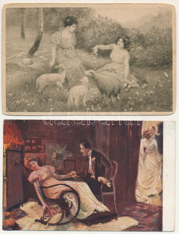 Leírás: 14 db RÉGI művészlap: romantika / 14 pre-1945 art postcards: romance