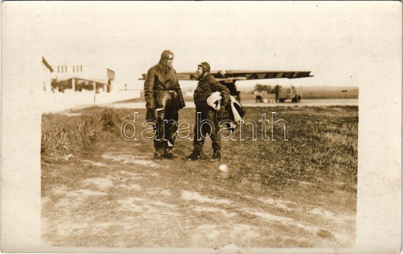 Leírás: Magyar Légiforgalmi R.T. repülőgép pilóták, háttérben a "H. MABF." jelű repülőgép / Hungarian aircraft pilots. photo