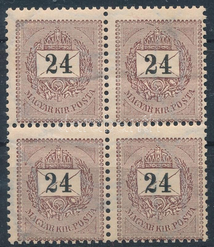 Leírás: 1889 24kr POSTATISZTA négyestömb, 12 : 11 3/4 fogazással, enyhén képbe fogazva, nagyon szép állapotban (56.000)
