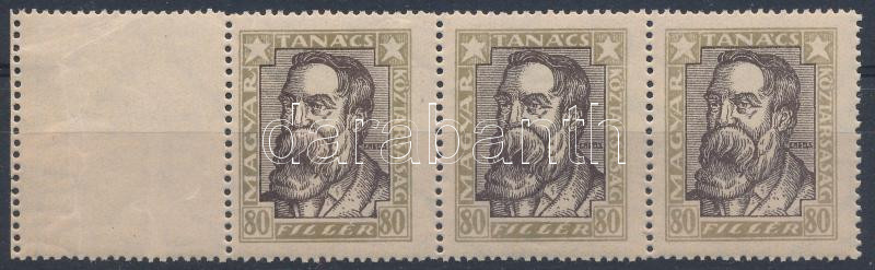 Leírás: 1919 Magyar Tanácsköztársasági arcképek 80f 3-as csík bal oldalon üres mezővel, álló vízjellel, papírránccal (74.000)