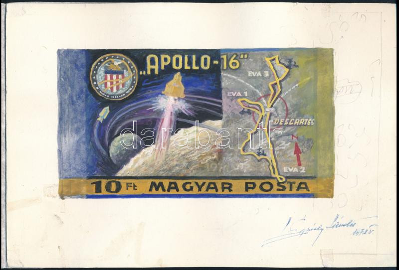1972 Légrády Sándor Apollo-16 10Ft bélyegterve a tervező aláírásával. ... https://www.darabanth.com/hu/500-Gyorsarveres/500.0/Kiemelt-magyar-filatelia-tetelek-es-gyujtemenyek/Egyes-magyar-kiadasok-rendkivul-alacsony-kikialtasi-aron~1/1972-3Cem3ELegrady-Sandor3Cem3E-Apollo-16-10Ft-belyegterve-a-tervezo-alairasaval-Kepmeret-~II3406017