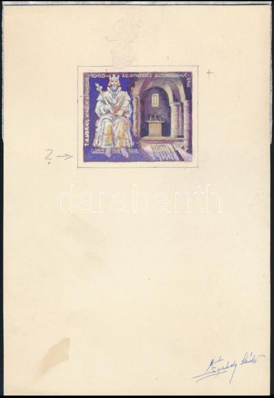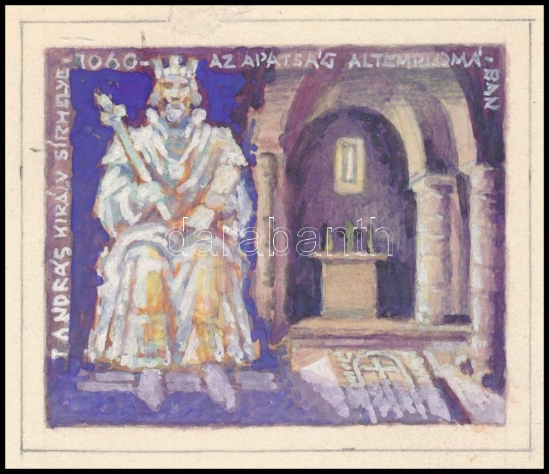 Leírás: Légrády Sándor I. András király bélyegterve névérték nélkül, a tervező aláírásával. Képméret: 57 x 47 mm