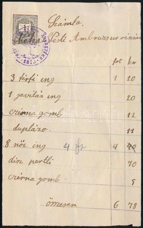 Leírás: ~1890 Nagykőrösi számla okmánybélyeg helyett 1kr postabélyeggel