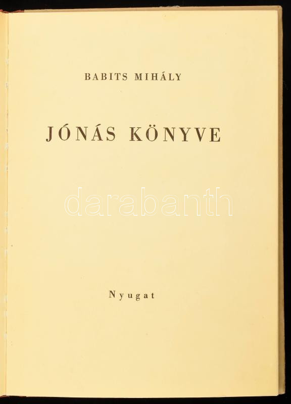 Babits Mihály: Jónás könyve. Bp., 1947, Nyugat. Kiadói félvászon-kötés, kissé kopott borítóval, a gerincen apró sérülésekkel. Számozott (98./1000) példány