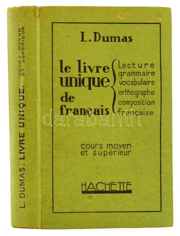 Dumas, [Lucien]: Le livre unique de francais. Cours moyen et supérieur. Paris, 1928, Hachette, 422 p. Francia nyelven. Kiadói egészvászon-kötés, a borítón kis sérülésekkel.