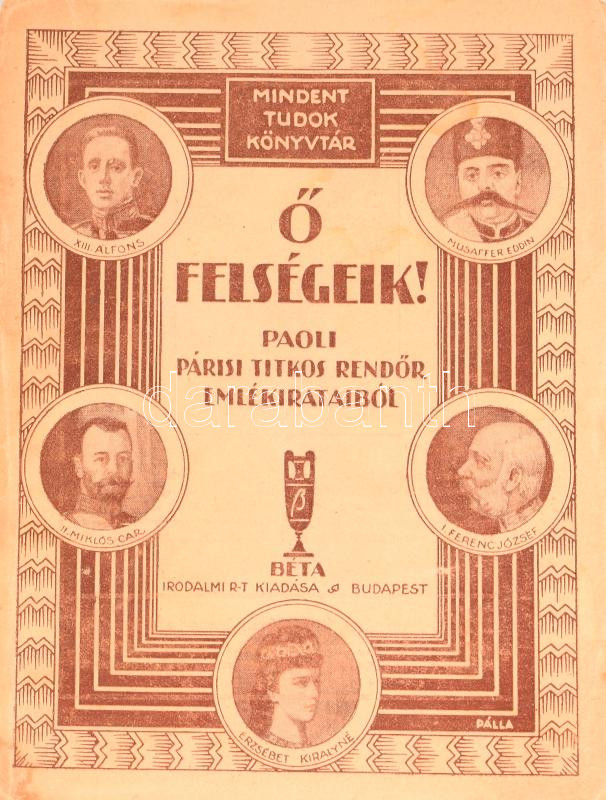 Fechner M. Ágoston: Ő felségeik. Paoli emlékiratai után írta: - -. Mindent Tudok Könyvtár. Bp.,[1924], Béta, 105+7 p. A borítón XIII. Alfons, II. Miklós cár, Musaffer Eddin, I. Ferenc József, Erzsébet királyné arcképével. A borító Pálla Jenő munkája. Kiadói illusztrált papírkötés, szakadt borítóval.