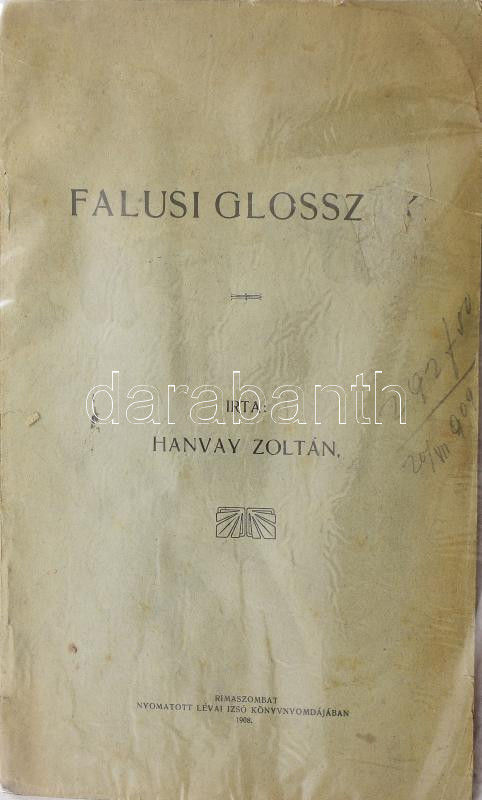 Hanvay Zoltán: Falusi glosszák. Rimaszombat, 1908. Lévai Izsó. 77p. Fű... https://www.darabanth.com/hu/500-Gyorsarveres/500.0/Konyvek/Konyvek-Egyeb-ritkasagok~2500135/Hanvay-Zoltan-Falusi-glosszak-Rimaszombat-1908-Levai-Izso-77p-Fuzve-kiadoi-boritoval-~II3411516