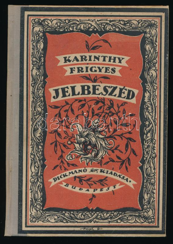 Karinthy Frigyes: Jelbeszéd. (Válogatott novellák.) A borító rajza Végh Gusztáv (1889-1973) munkája. Bp.,[1921],Dick Manó,(Korvin-ny.), 158+2 p. javított félvászon kötésben, az eredeti papírborító felhasználásával. Első kiadás?