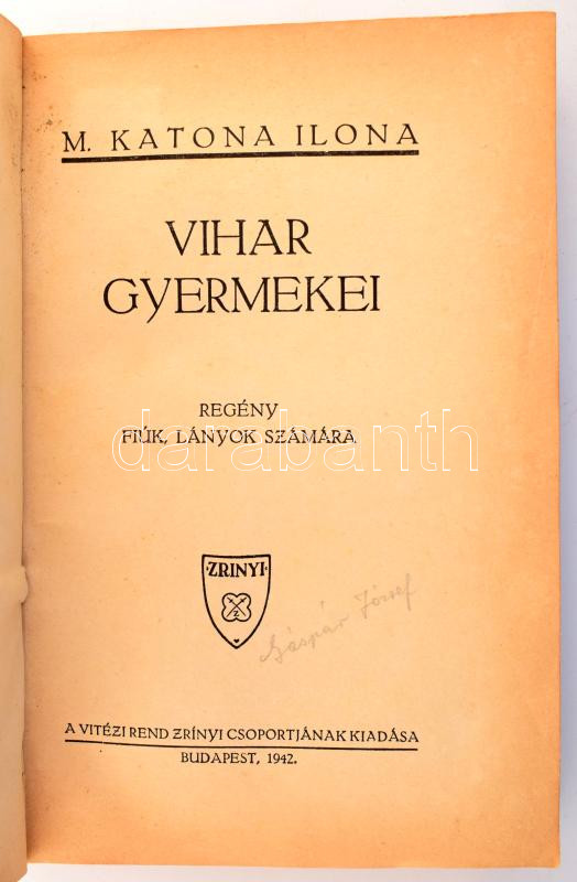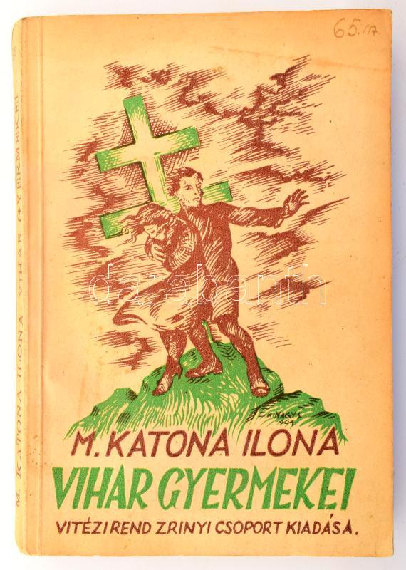 M. Katona Ilona: Vihar gyermekei. Regény fiúk, lányok számára. Bp., 1942, Vitézi Rend Zrínyi Csoportja, 164+2 p.A címlapot és a belső rajzokat K. Nagy Sándor rajzolta. Kiadói papírkötés, foltos borítóval.