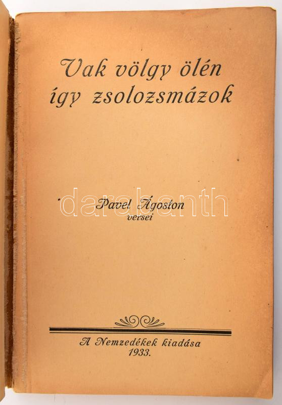 Pável Ágoston: Vak völgy ölén így zsolozsmázok. - - versei. Szombathel... https://www.darabanth.com/hu/500-Gyorsarveres/500.0/Konyvek/Konyvek-Egyeb-ritkasagok~2500135/Pavel-Agoston-Vak-volgy-olen-igy-zsolozsmazok--versei-Szombathely-1933-Nemzedekek-~II3409116