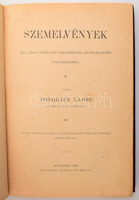 Pongrácz Lajos: Szemelvények egy régi vármegyei táblabírónak hátrahagyott dolgozataiból. Egy régi vármegyei táblabírónak hátrahagyott dolgoztaiból. Bp., 1898., Budapesti Hírlap, 260 p. Kiadói egészvászon-kötés, kopott borítóval.