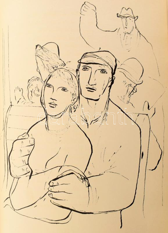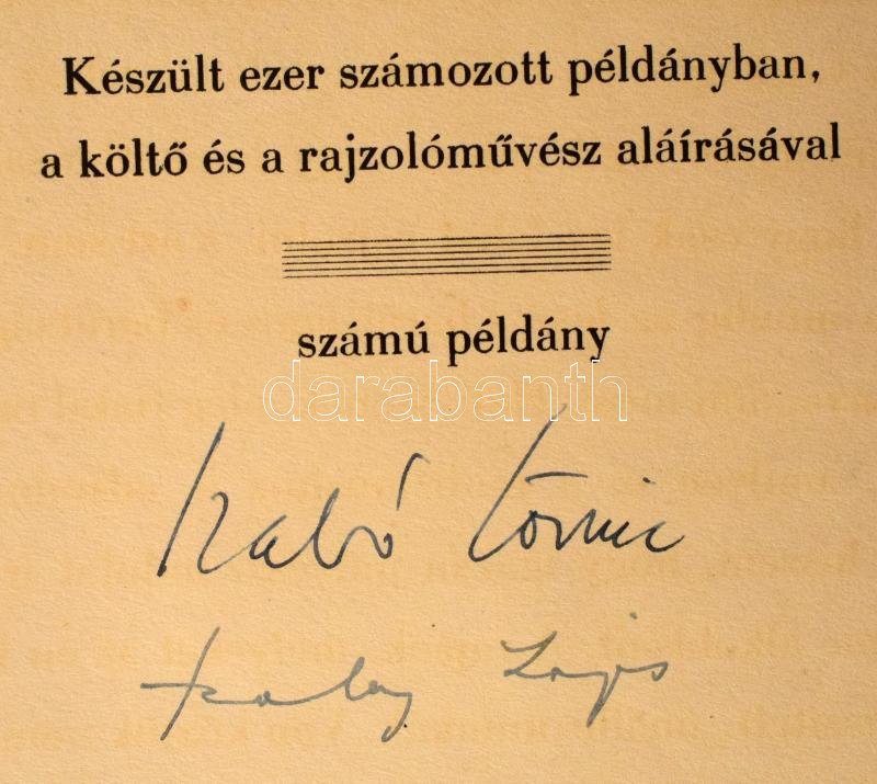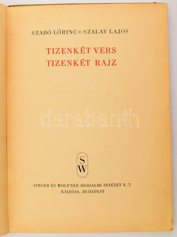 Szabó Lőrinc - Szalay Lajos: Tizenkét vers - Tizenkét rajz. Számozatlan példány, a szerző, Szabó Lőrinc (1900-1957), és a művész, Szalay Lajos (1909-1995) autográf aláírásával ellátott példány! Bp., 1943, Singer és Wolfner (Hungária-ny.), 64+(4) p. Kiadói illusztrált félvászon-kötés, kopott, foltos borítóval, sérült gerinccel.