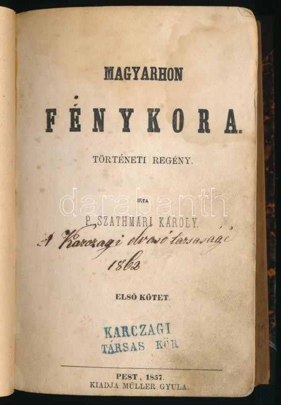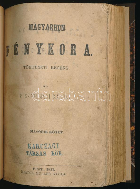 Leírás: [Szathmáry Károly, Péterfalvi (1831-1891)] P. Szathmári Károly: Magyarhon fénykora. Történeti regény. I-II. köt. [Egybekötve]. Pest, 1857, Müller Gyula, 2 sztl. lev.+ 170+(2) p.; 1 sztl. lev.+ 177+(3) p. Első kiadás. Félvászon-kötésben, kissé kopott borítóval, foltos lapokkal, egy lapon lapszéli sérüléssel, tulajdonosi bejegyzéssel és bélyegzővel.