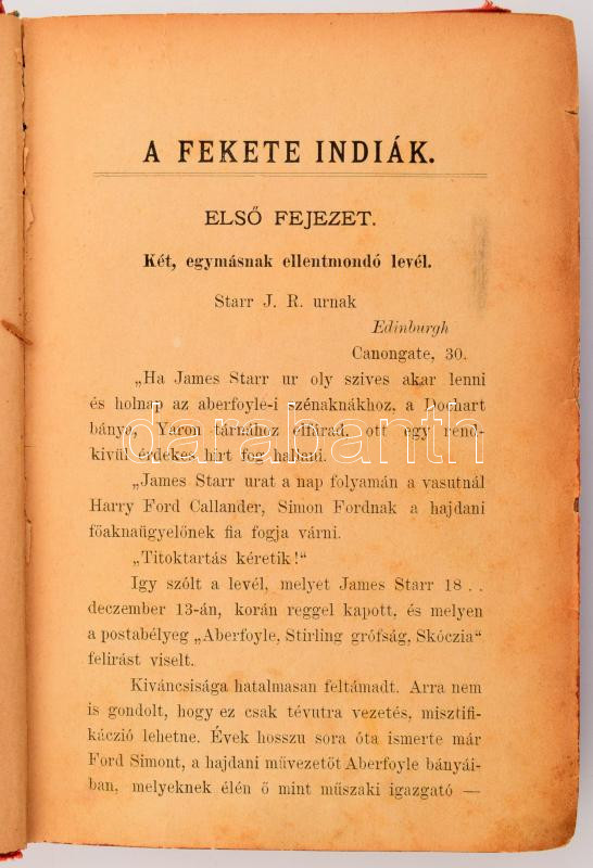 Verne Gyula: A fekete indiák. Ford.: Zempléni P. Gyula. [Bp.,1891, Eisler G.], 3-261+3 p. Kiadói aranyozott, festett, illusztrált egészvászon-kötés, Gottermayer-kötés, kopott borítóval, a gerincen kis sérüléssel, hiányzó címlappal, kissé foltos lapokkal, egy lapon ceruzás bejegyzéssel, javított kötéssel és egy javított lappal (25/26 p.), egy-két sérült lappal, közte: egy lap sarkán kis hiánnyal (85/86 p.), egy helyen a fűzés laza (70-75 p.)