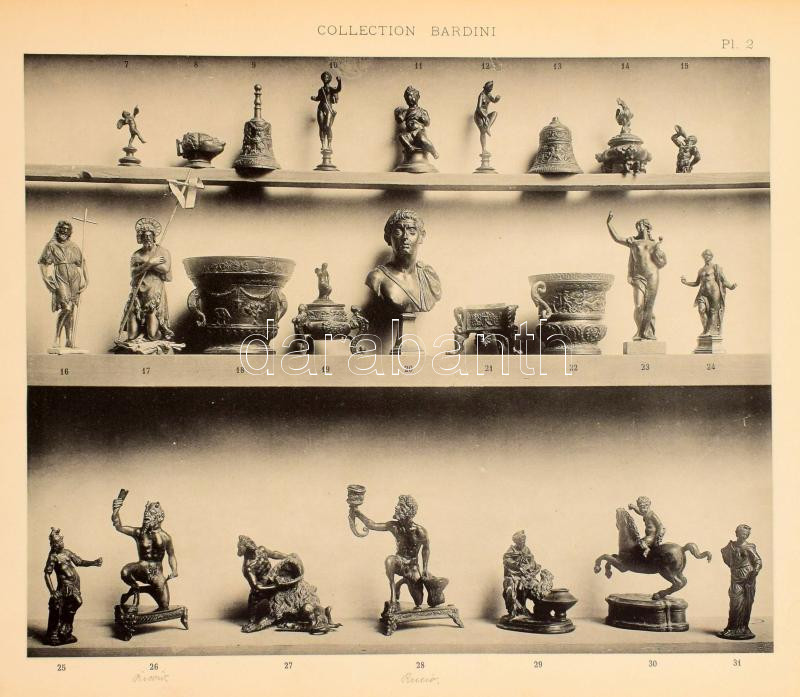 1902 Collection Bardini. Catalogue des objets d'art antiques, du Moyen Age et de la Renaissance. (Kiállítási katalógus). Paris, 1902, Imp. de l'Art E. Moreau et Cie. Egészoldalas fekete-fehér képekkel gazdagon illusztrálva. Francia nyelven. Kiadói egészvászon-kötés, sérült, szétvált fűzéssel, kijáró lapokkal.