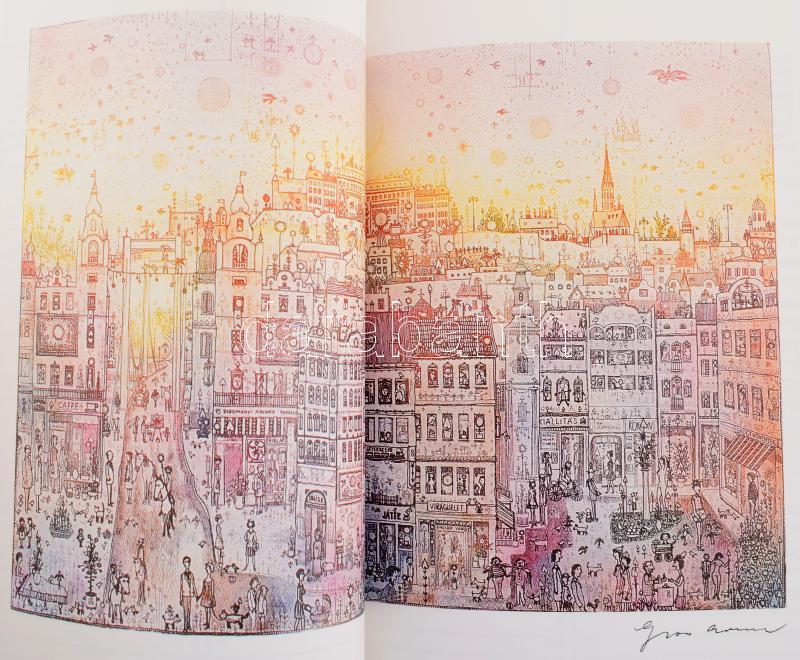 1991 Technoimpex Terminkalander. Gross Arnold (1929-2015) grafikus 12 színes grafikáival illusztrált. Bp., 1990, Technoimpex, (Népszava-ny.) Angol, német, magyar és francia nyelven. Kiadói egészműbőr-kötés, a borítón Gross Arnold illusztrációjával.