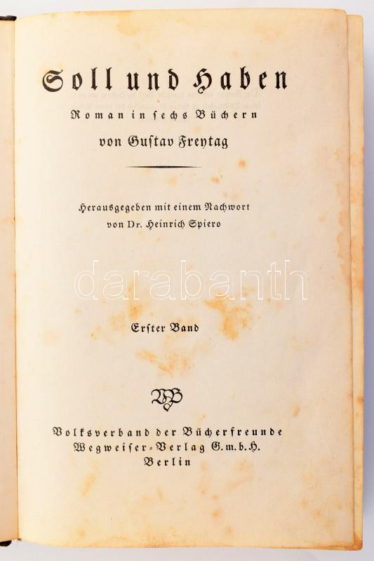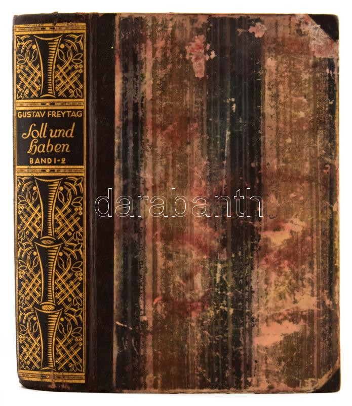 Freytag, Gustav: Soll und Haben. Roman in sechs Büchern. Herausgegeben mit einem Nachwort von Dr. Heinrich Spiero. Band 1-2. [Egybekötve]. Berlin, é.n., Volksverband der Bücherfreunde Wegweiser-Verlag, 487+(1) p.; 355+(3) p. Német nyelven. Aranyozott gerincű félbőr-kötésben, viseltes borítóval, helyenként foltos lapokkal, az 1. kötetből a 385-420. oldalak hiányoznak.