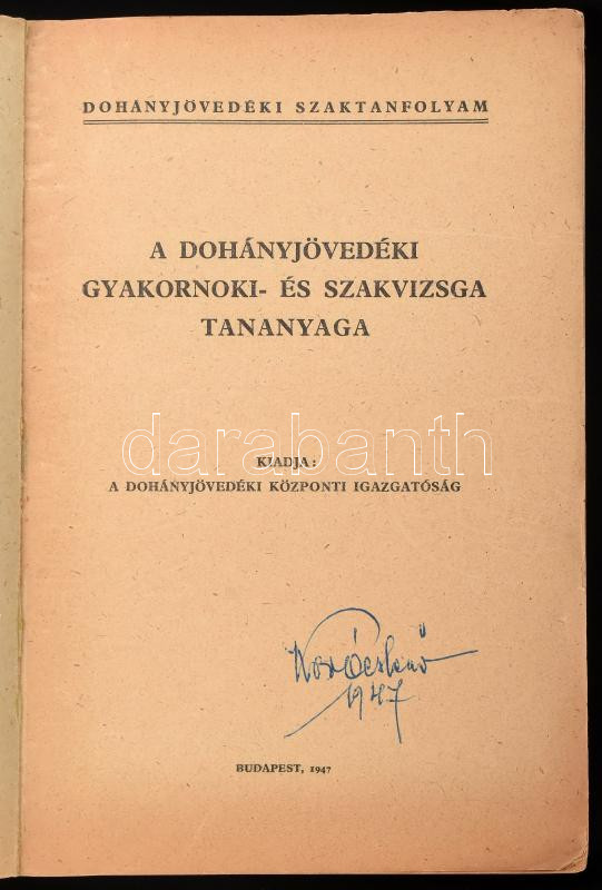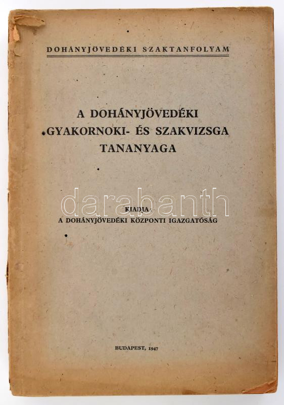 A Dohányjövedéki gyakornoki- és szakvizsga tananyaga. Dohányjövedéki Szaktanfolyam. Bp., 1947, Dohányjövedéki Központi Igazgatóság, (Magyar Állami-ny.), 573 p. Kiadói papírkötés, kissé sérült gerinccel.