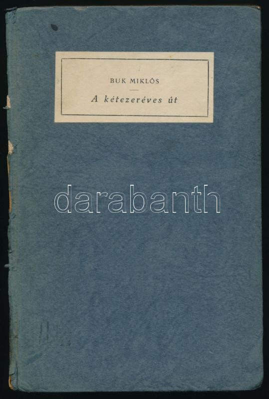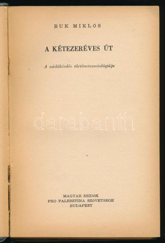 Buk Miklós: A kétezeréves út. A zsidókérdés történetszociológiája. Javne Könyvek 13. Bp., [1943], Magyar Zsidók Pro Palesztina Szövetsége (Kolozsvár, András László-ny.), 203+(1) p. Első kiadás. Kiadói kartonált papírkötés, sérült, hiányos gerinccel, belül a lapok jó állapotban.