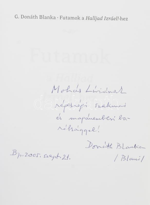 G. Donáth Blanka: Futamok a Halljad Izráel!-hez. A szerző, G. Donáth Blanka (1921-2015) pszichológus által Mohás Lívia (1928-2024) pszichológus, József Attila-díjas írónak DEDIKÁLT példány. Bp., 2005, Arktisz. Kiadói papírkötés.