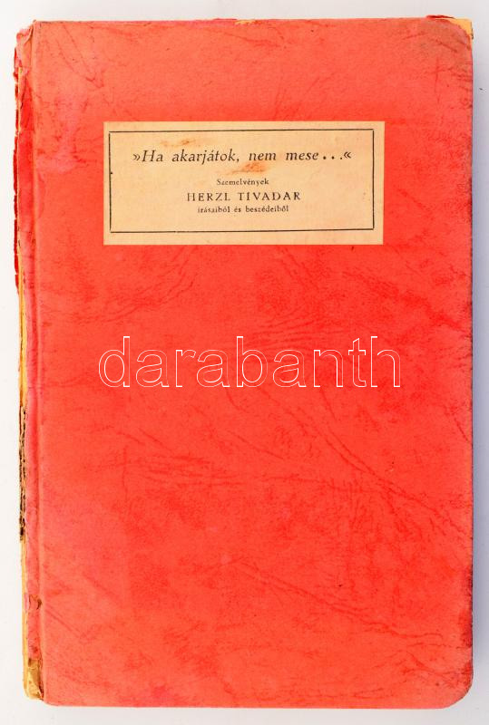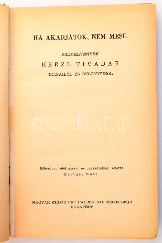 Herzl Tivadar: "Ha akarjátok, nem mese..." Szemelvények Herzl Tivadar naplójából, cikkeiből, beszédeiből. Előszóval, életrajzzal, és jegyzetekkel ellátta: Gärtner Mose. Javne-könyvek 5. Bp.,[1942], Magyar Zsidók Pro Palestina Szövetsége, 106+2 p. + 1 t. Kiadói kartonált papírkötés, kopott, foltos borítóval, hiányzó gerinccel, foltos címképpel.