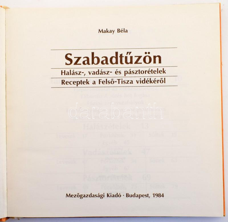 Leírás: 4 darab receptkönyv. Soltész Béla - Méló László: Vadászírások, vadász receptek. Bp.,1987,Sport. Kiadói papírkötés + Tolnai Kálmán: Halat, s vadat. Szakácskönyv horgászoknak, vadászoknak. Bp., 1983. Népszava. Kiadói papírkötésben + Balyó Mária-Pelle Józsefné: Bogrács és kukta. + Makay Béla: Szabadtűzön. Halász-, vadász- és pásztorételek. Recept a Felső-Tisza vidékéről. Bp., 1984., Mezőgazdasági. Kiadói kartonált papírkötés.