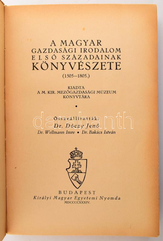 A magyar gazdasági irodalom első századainak könyvészete (1505-1805.) Bibliographia Litterarum Hungariae Oeconomicarum Tomus Primus. Összeáll.: Dóczy Jenő, Wellmann Imre, Bakács István. Bp., 1934, Kir. M. Mezőgazdasági Múzeum, (Kir. M. Egyetemi-ny.), 354 p.+8 t. Kiadói papírkötés, a borítószéleken kis szakadásokkal, foltos borítóval.