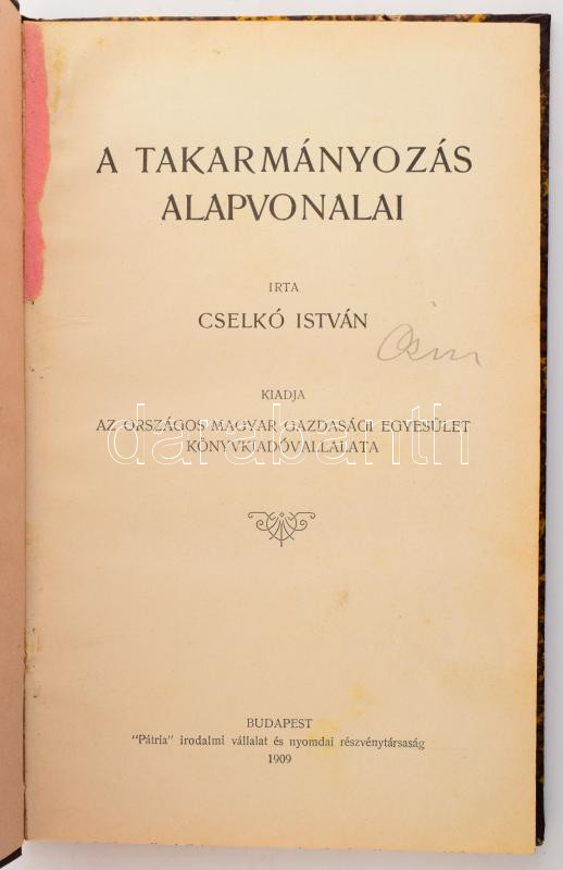 Cselkó István: A takarmányozás alapvonalai. Bp., 1909, Országos Magyar Gazdasági Egyesület, ("Pátria"-ny.), 106+2 p. Korabeli átkötött félvászon-kötés, Csurgó, Vágó Gyula-kötés, kissé kopott borítóval, kissé foltos lapokkal.