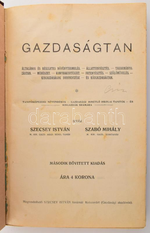 Szecsey István - Szabó Mihály: Gazdaságtan. Általános és részletes növénytermelés, állattenyésztés, takarmányozástan, méhészet, konyhakertészet, fatenyésztés, szőlőművelés. Kisgazdaságok berendezése és közgazdaságtan. Tanítóképezdei növendékek, gazdasági ismétlőiskolai tanítók és kisgazdák számára. Kolozsvár, 1907., Gaman J. örököse, 4+374+1+VI p. 2., bővített kiadás. Korabeli átkötött félvászon-kötés, Csurgó, Vágó Gyula-kötés, kissé kopott borítóval, kissé foltos lapokkal, az elején ceruzás aláhúzásokkal és bejegyzésekkel, egy kijáró lappal (13/14 p.)