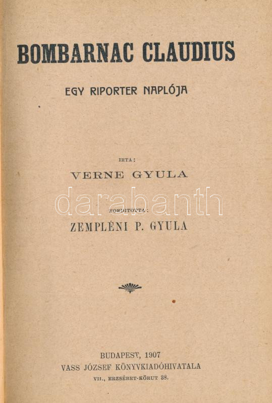 Verne, [Jules] Gyula: Bombarnac Claudius. Egy riporter jegyzőkönyve. Fordította Zempléni P. Gyula Budapest, 1907. Vass József könyvkiadó vállalata. 300p.