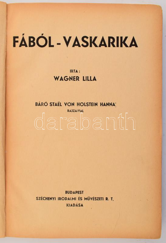 Wagner Lilla: Fából-vaskarika. Báró Stael von Holstein Hanna rajzaival. Bp.,(1940),Széchenyi, 156 p. Kiadói félvászon-kötés, kopott, foltos borítóval, laza fűzéssel.