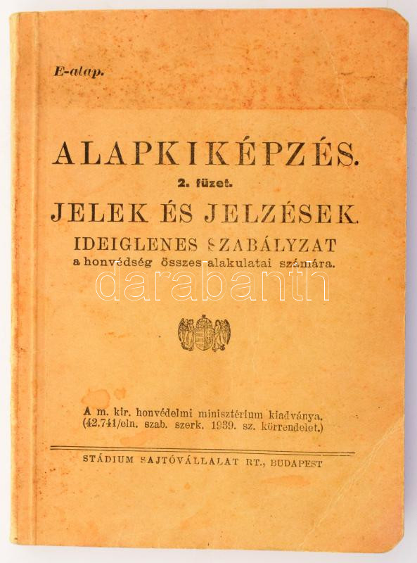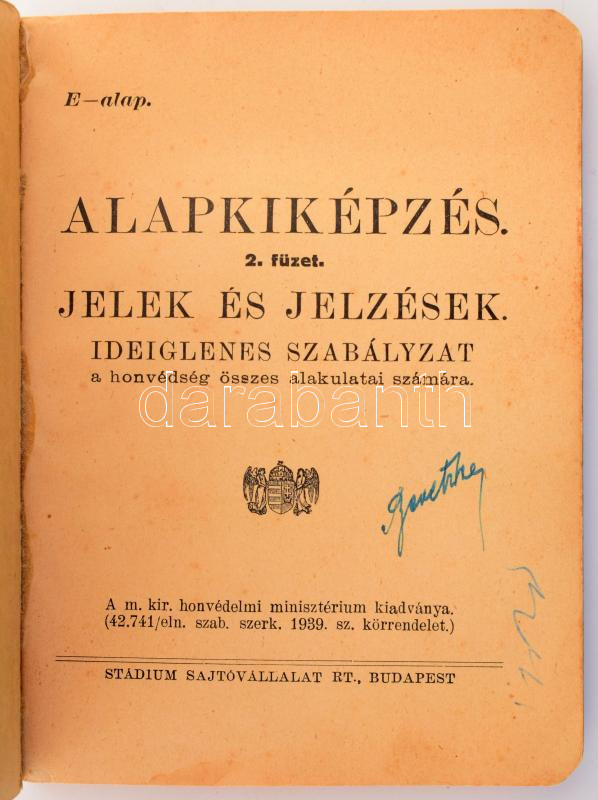 Alapkiképzés. Jelek és jelzések. Ideiglenes szabályzat a honvédség összes alakulatai számára. (2. füzet.) 1944. évi kiadás. Budapest, 1944. Magyar Királyi Honvédelmi Minisztérium - Stádium Sajtóvállalat Rt. 216 p. + 2 t. (kétoldalas) + 1 térkép (szÃnes, kétoldalas). Oldalszámozáson belül szövegközti ábrákkal gazdagon illusztrált szakmunka a katonai vezénylés, katonai térképészet, tájékozódás és hÃrközlés témakörébÅ‘l, a csapattestek, útakadályok, vezénylési mozdulatok, kürtjelzések jelrendszerével, a tengelyhatalmi és szövetséges hatalmi repülÅ‘gépek felségjelzéseinek szÃnes ábráival (melyek közül különösen megdöbbentÅ‘ a finn légierÅ‘ felségjelzése). Fűzve, foltos kiadói borÃtóban.