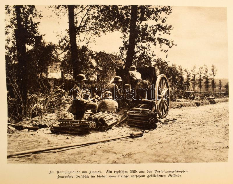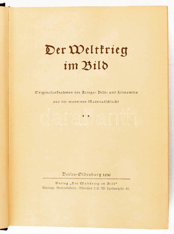 Der Weltkrieg im Bild. Originalaufnahmen des Kriegs-, Bild- und Filmamtes aus der modernen Materialschlacht. Berlin - Oldenburg, 1926, Verlag "Der Weltkrieg im Bild", 350 p. Német nyelven. Gazdag fekete-fehér képanyaggal illusztrált. Kiadói aranyozott egészvászon-kötés, kopott borítóval, a hátsó tábla és a hátsó szennylap foltos.
