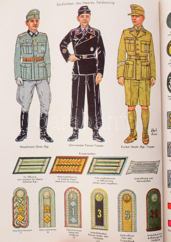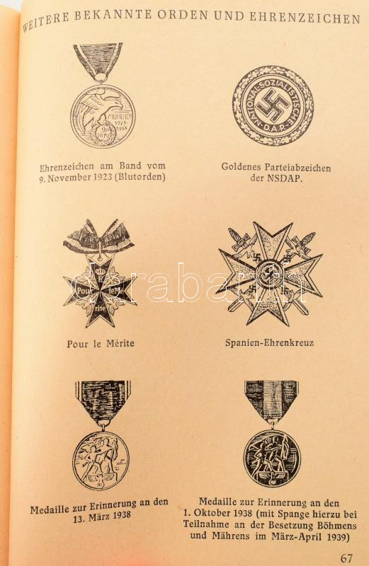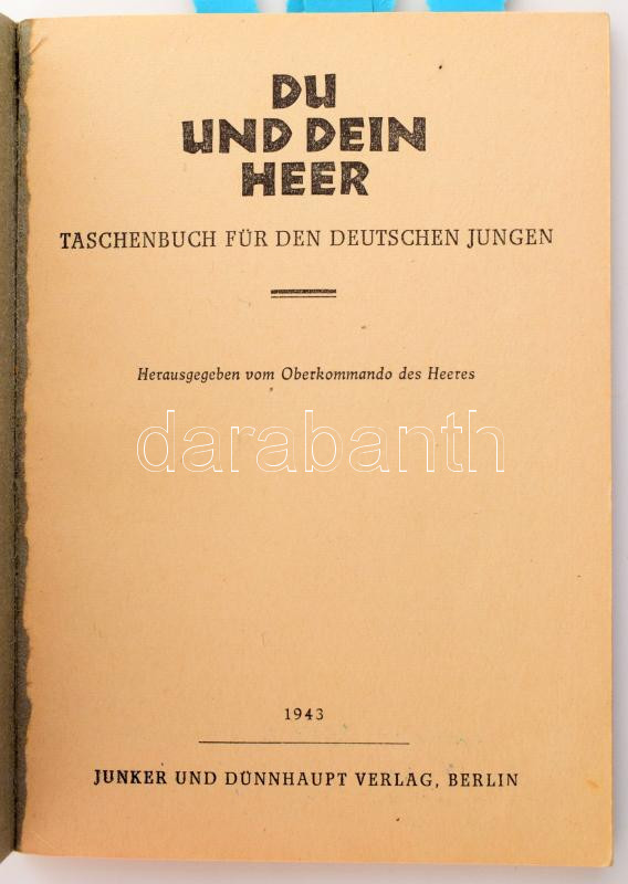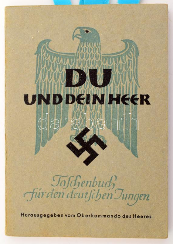 Du und Dein Heer. Taschenbuch für den deutschen Jungen. Hrsg. von Oberkommando des Heeres. Berlin, 1943, Junker und Dünnhaupt, 82+1 p. Német nyelven. Fekete-fehér és színes illusztrációkkal, köztük rangjelzésekkel, különféle jelzésekkel, kitüntetésekkel, ...stb. Kiadói papírkötés.